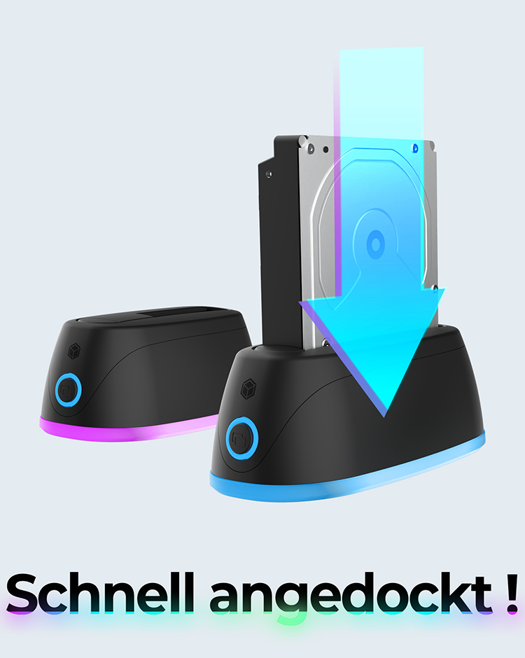 Ambiente für Ihren ArbeitsplatzDie Ambientbeleuchtung zieht sich als blauer Streifen einmal um das Gehäuse herum. Die blaue kreisförmige LED hat nicht nur einen optischen Effekt, sondern zeigt auch Betrieb und Zugriff der Festplatte an. Diese DockingStation ergänzt ihr Büro oder Home Office als technisch zuverlässiges Designobjekt.