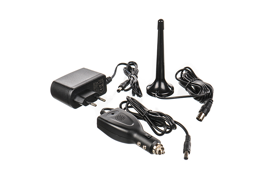 Das schlanke Gerät im stilvollen grauen Gehäuse hat eine Teleskopantenne mit Magnetfuß und ein KFZ-Ladekabel (12V - 24V) im Lieferumfang enthalten. Eine praktische Fernbedienung gehört ebenfalls dazu.