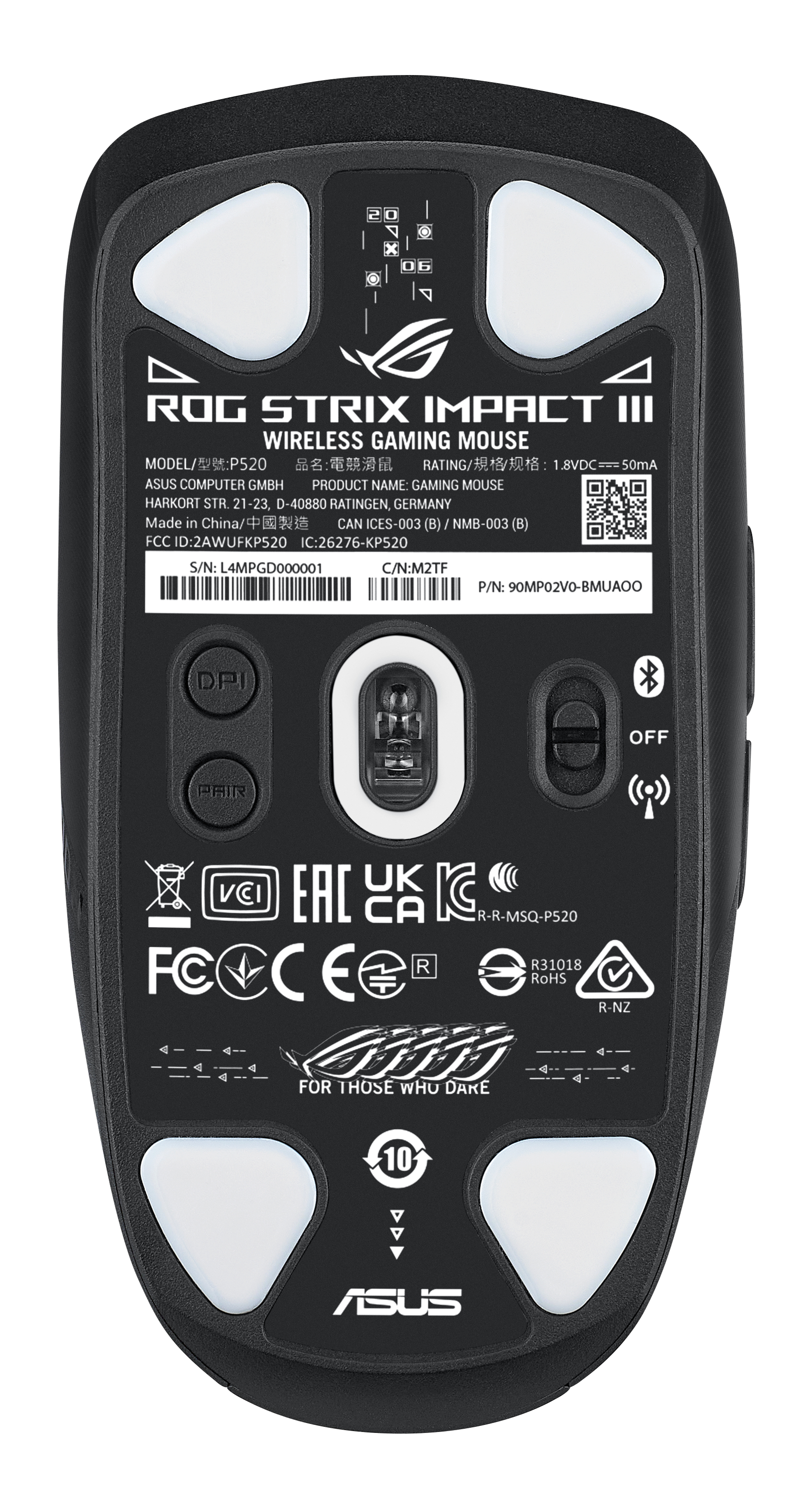 Die in der ROG Strix Impact III Wireless verwendeten Schalter haben eine Lebensdauer von 70 Millionen Klicks. Um die Abweichung der Schalterkraft zwischen der linken und der rechten Maustaste zu minimieren, werden Schalter mit einer Abweichung von +/- 5 Gramm (g) zusammen sortiert, um ein einheitliches Klickgefühl zu gewährleisten.